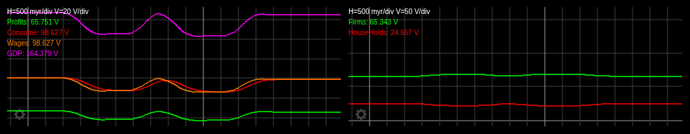 This makes it possible to develop economic models with these tables, by defining these flows in terms of each other and relevant parameters. Here we implement this in CircuitJS, using the same approach as Matlab does with Simulink: flowcharts are used to generate equations for numerical simulation. The circuit to the left implements the following equations
